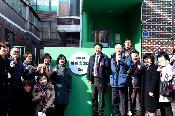 서울 노원구는 30일 다우리마을 마당에서 ‘아이휴(休)센터 2호점’ 개소식을 개최했다. 이날 행사에서는 타일 페인팅 퍼포먼스, 현판 제막식 등이 진행됐다. 사진은 오승록 구청장(오른쪽에서 5번째)과 관계자들이 기념촬영을 하는 모습. (사진제공=노원구청)