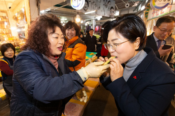30일 김미경 은평구청장이 지역주민들의 따뜻하고 안전한 설연휴를 위해 응암동 대림시장을 방문, 지역물가와 다중이용시설 안전점검 등 민생현장을 점검했다. 사진은 대림시장을 방문한 김 구청장이 지역 상인을 격려하고 있는 모습. (사진제공=은평구청)