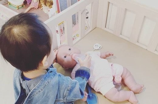공개된 사진은 별-하하 부부의 둘째 아들 소울 군의 모습을 담고 있다. 특히, 아기 인형에 우유를 먹여주는 고사리 손이 귀엽다.