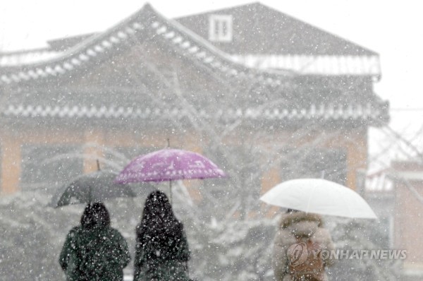 창원지역 새해 첫눈이 내린 31일 우산을 쓴 시민이 창원시 의창구 일대 거리를 지나고 있다.