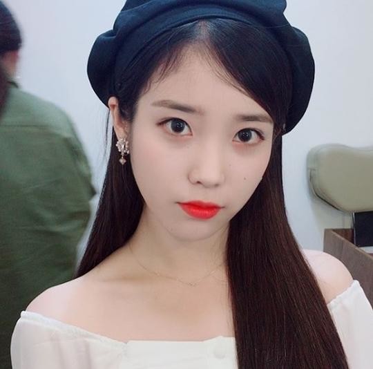 공개된 사진 속 아이유는 빵 모자를 쓰고 카메라를 응시하고 있다.