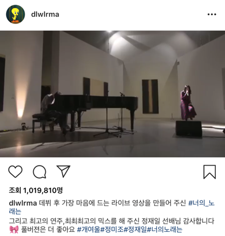 이와 함께 "데뷔 후 가장 마음에 드는 라이브 영상을 만들어주신 '너의 노래는', 그리고 최고의 연주, 최최최고의 믹스를 해주신 정재일 선배님 감사하다"고 적었다.