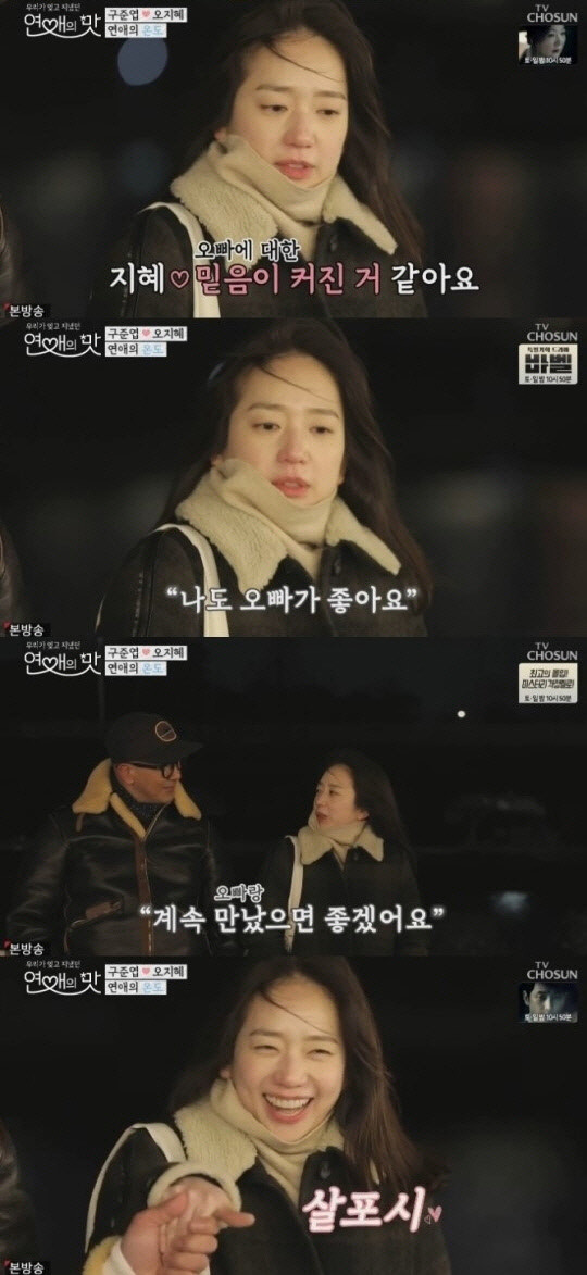 구준엽은 "엄마 만났을 때 네가 하는 것을 보고 괜찮은 여자구나 생각했다. 점점 더 좋아졌다. 너는 어떠냐"라고 물었다. 오지혜는 "만남을 거듭할수록 오빠에 대한 믿음이 커졌다. 나도 오빠가 좋다. 계속 잘 만났으면 좋겠다"라고 고백했다.