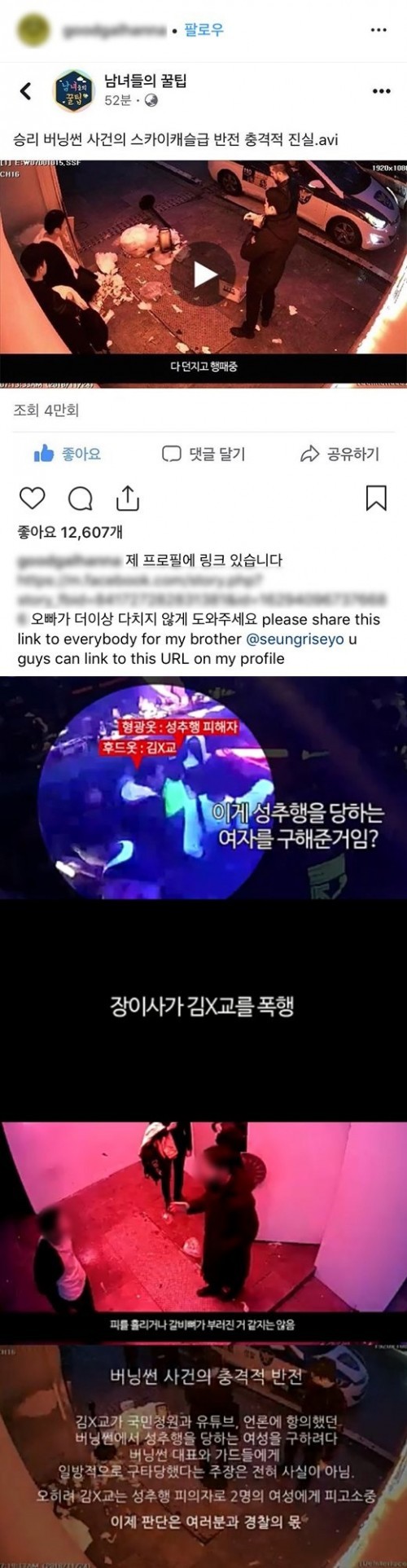 해당 영상은 클럽 '버닝썬' 사건 당시 CCTV 영상을 편집해 자막과 함께 요약한 것으로, 폭행당한 손님 김모씨가 성추행을 하고 클럽 직원에게 화풀이를 했으며 경찰에게는 폭력적으로 대했다고 주장하는 내용이 담겨있다.
