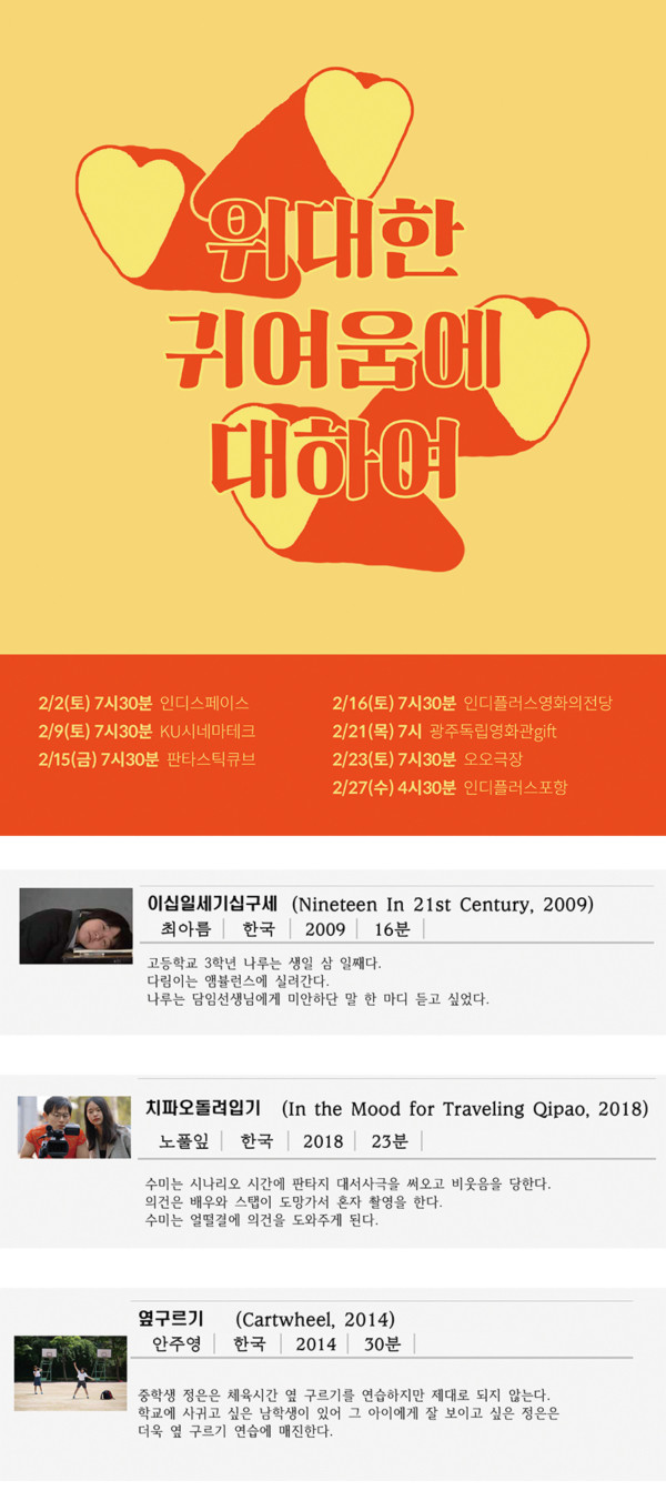 한편, 매달 15일에는 상업영화들에 밀려 빛을 보지 못한 단편영화를 선정하여 매달 각기 다른 주제로 만나보는 ‘단편영화 특별기획전’이 열린다. 이번에는 '오렌지필름 단편 기획전-위대한 귀여움에 대하여'가 열린다. 기획전은 총 세 편으로 '이십일세기십구세', '치파오돌려입기', '옆구르기' 등 총 3편의 단편영화를 만나볼 수 있다.