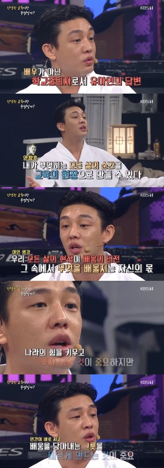주제인 '교육'은 유아인에게도 꽤 특별했다. 유아인은 고등학교를 중퇴했기 때문이다. "부모님으로부터 어떤 교육을 받았느냐"는 질문을 받은 유아인은 "부모님과 친하게 지내면서 이런 저런 이야기를 했다. 그러다 반항심이 돋아서 서울로 상경하기도 했고, 갑자기 진로를 바꿔 배우가 되겠다고 말씀도 드렸다"고 말문을 열었다. 그러면서 "찬성, 반대 안 하시고 제 의사만 확고하게 묻고 자유롭게 두셨다"고도 말했다.
