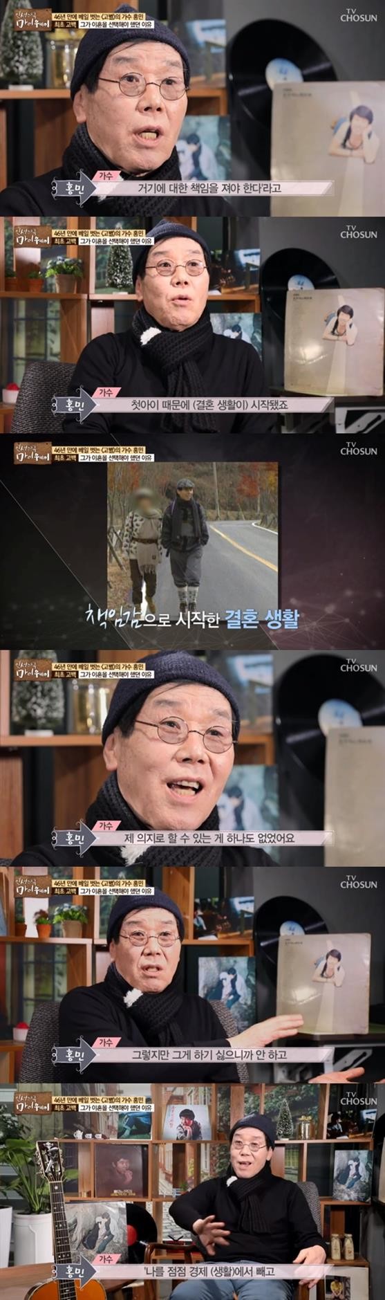 이날 홍민은 결혼 생활에 대해 말문을 열었다. 그는 "남녀 간에 처음에 만나서 돌발적으로 무슨 일이 일어나면 거기에 대해 책임을 져야 한다고 생각하는 세대다. 첫아이 때 그렇게 시작됐다"고 결혼을 하게 된 이유를 밝혔다.