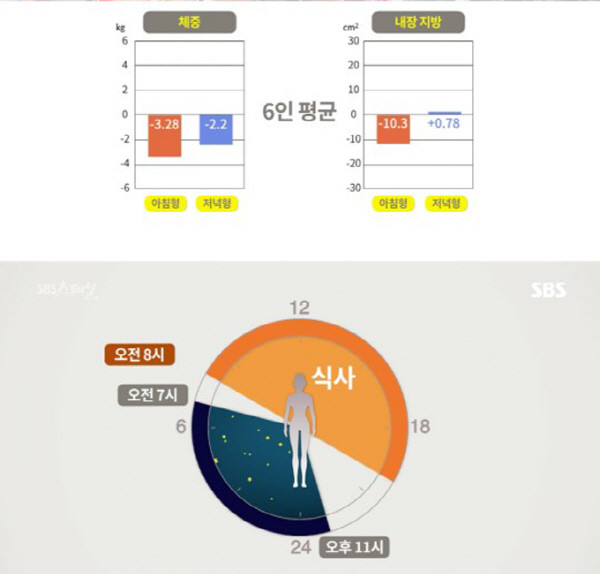 그 결과 대부분의 도전자들에서 아침형 간헐적 단식이 더 좋은 결과를 얻게 됐다. 일부 도전자들은 저녁형 간헐적 단식 후 오히려 내장지방 등의 수치가 올라가기도 했다.