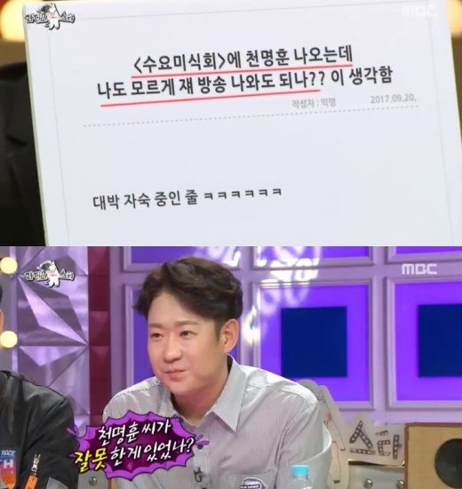 앞서 지난해 MBC 예능 프로그램 ‘라디오스타’에서 날 천명훈은 "이상하게 자숙 이미지가 있다. 음주나 도박을 한 번도 한 적이 없고 물의를 일으킨 적이 없는데 그렇다"고 말한 바 있다.