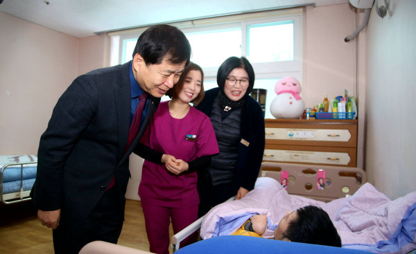 최근 장석웅 전남도교육감은 중증장애인 시설인 목포장애인요양원과 노숙인·고아·장애시설인 애중복지재단을 방문해 관계자를 격려하고 해당 시설에서 필요로 하는 물품(식기건조기·이불 등의 생필품)을 전달했다. 사진은 장 교육감이 장애인과 이야기를 나누고 있는 모습. (사진제공=전남도교육청)