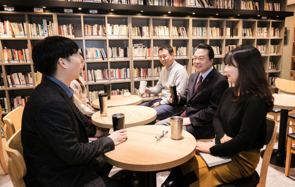 최근 노현송 강서구청장이 직원소통 공간 톡톡살롱에서 직원들과 텀블러를 활용한 티타임을 가지고 있다. 플라스틱 프리챌린지 캠페인은 일회용 플라스틱의 무분별한 사용에 대한 경각심을 주고 플라스틱 사용을 줄이고자 진행되고 있다. 노 구청장은 한정애 국회의원과 진성준 정무부시장을 다음 플라스틱 프리 첼린지 대상자로 지목했다. (사진제공=강서구청)