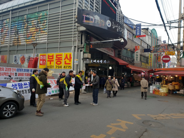 경기 하남시는 최근 직원 30명을 2개조로 편성해 지역내 전통시장인 신장·덕풍시장 주변 상인들을 대상으로 생활폐기물 배출 안내 및 무단투기 근절 홍보 캠페인을 실시했다. 사진은 생활폐기물 배출법 등의 내용이 적힌 홍보물을 전달하는 모습. (사진제공=하남시청)