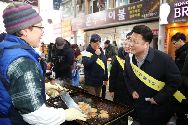 엄태준 경기 이천시장이 지난 4일 관고동 전통시장을 방문해 민생 현장을 살폈다. 이날 엄 시장은 시장을 둘러보며 시장 상인들과 지역 소상공인들의 애로사항을 청취하고 이들을 격려했다. 사진은 엄 시장이 상인과 이야기를 나누고 있는 모습. (사진제공=이천시청)
