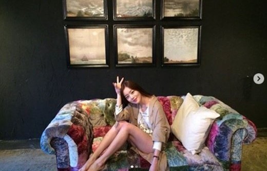 공개된 사진 속 한선화는 맨발로 소파에 앉아 손으로 V를 그리고 있다.