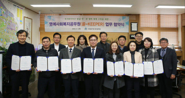 인천 미추홀구는 7일 미추홀·숭의·인천종합사회복지관 등 지역내 11개 사회복지기관과 복지위기가구 발굴을 위한 민·관 업무협약을 체결했다. 사진은 김정식 구청장 및 관계자들이 협약서를 들고 기념촬영을 하는 모습. (사진제공=미추홀구청)
