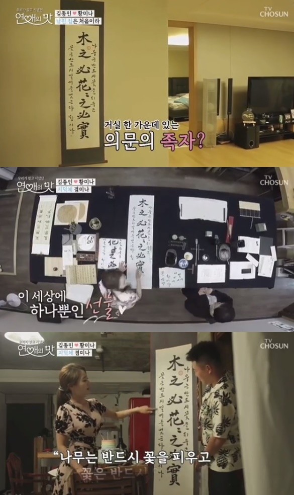 공개된 영상은 황미나가 김종민을 위해 직접 쓴 서예 족자를 선물한 것으로 김종민은 이를 자신의 집에 걸어놨다. 황미나는 해당 족자를 김종민에게 선물하며 “’나무는 반드시 꽃을 피우고 꽃은 반드시 열매를 맺는다’라는 뜻이다”며 “오빠 하는 일이 열매를 잘 맺으라고 써봤다”고 말해 김종민을 감동하게 했다.