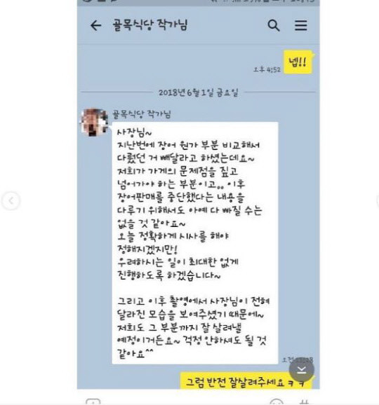 장어집 사장은 이 때문에 촬영 다음 날 자신의 입장을 정리한 이메일을 제작진에게 보냈다고 한다. 장어집 사장이 쓴 메일에는 다른 식당과의 장어 원가 비교, 1만6000원이라는 가격을 책정하게 된 경위 등이 상세히 적혀있었다. A씨는 첫 방송이 나가기 직전 제작진과 주고받은 메시지 내용도 공유했다. 제작진은 "장어 가격 장면을 아예 뺄 수는 없을 것 같다"면서도 "우려하는 일이 없게 진행하겠다"며 걱정하는 장어집 사장은을 안심시켰다.
