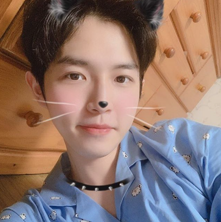 사진 속 그는 파란색 수호랑 잠옷을 입고 카메라를 바라보고 있다. 수줍은 표정을 짓고 있는 김재환의 모습에 귀여움이 드러난다.
