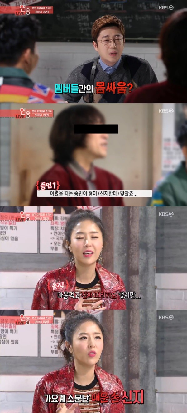 이날 김태진은 코요태의 장수 비결을 물으며 “멤버들간의 몸싸움을 한 적이 있냐”라고 질문했다. 빽가는 “어렸을 때는 종민이 형이 (신지한테) 맞았죠”라고 고백했다.