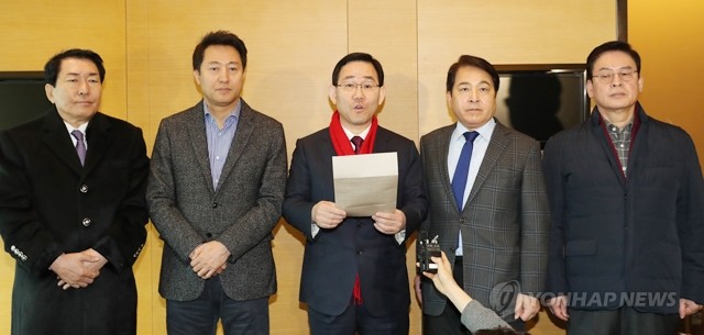 자유한국당 당권 출마를 선언한 안상수 의원(왼쪽부터), 오세훈 전 서울시장, 주호영·심재철·정우택 의원이 10일 오전 여의도 한 호텔에서 긴급 회동을 한 뒤 공동 입장문을 발표하고 있다. 홍표 전 대표는 전화 통화로 의견을 같이한다고 밝혀 공동 입장문에 함께 이름을 올렸다.