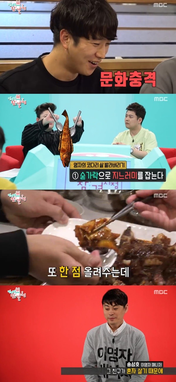 이에 두 매니저는 감탄했다. 이영자는 “숟가락으로 지느러미를 떼어낸 다음에 숟가락으로 들면 살만 나온다”고 설명했다. 또한 이영자는 김과 함께 먹는 것도 별미라며 맛있게 먹는 방법을 소개하기도 했다.