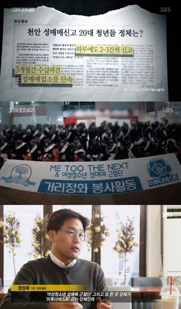 3년 전 검정 조끼와 마스크를 착용한 남성들은 성매수 남성으로 업소에 잠입해 증거를 포착하고 112에 신고, 경찰이 출동하면 사라지며 성매매 업주들을 공포에 떨게 했다. 한 기자는 “경기도에 정식으로 등록된 비영리 민간단체다. '여성청소년 성매매 근절단'과 '미투 더 넥스트'라는 이름으로 활동하고 있다”고 그들에 관해 밝혔다.