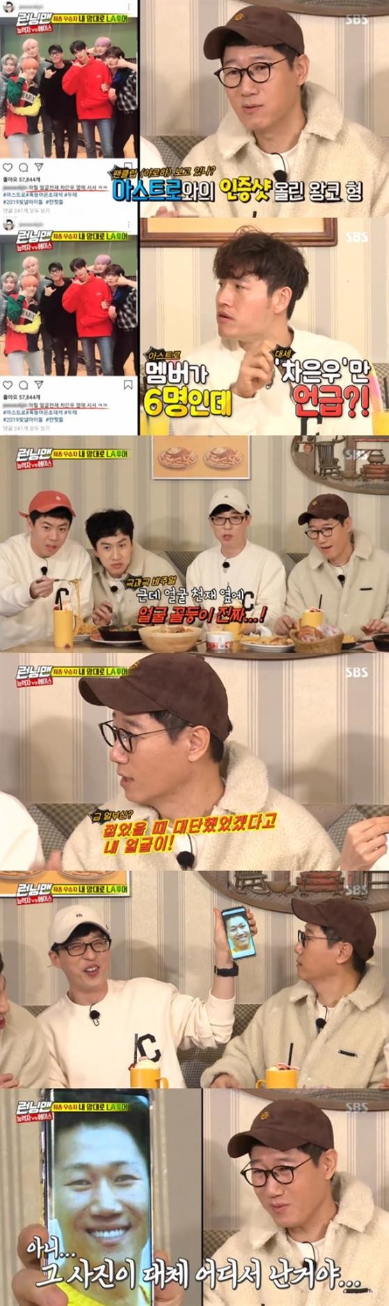 지석진은 자신에 SNS에 "하필 '얼굴 천재' 차은우 옆에 서서"라는 글과 함께 인증샷을 올렸다. 이에 김종국은 "그룹 멤버들이 저렇게 많은데 차은우만 언급하면 어떡하냐"고 타박했고, 지석진은 "하필 '얼굴 천재' 차은우 옆에 서서 그런 거 아니냐"고 해명했다.