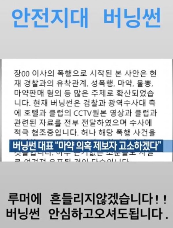 버닝썬 클럽 이문호 대표는 자신의 SNS를 통해 각종 논란에 강력히 대응하겠다는 입장이 담긴 방송 보도 화면을 캡처한 사진과 함께 "안전지대 버닝썬"이라는 글을 적었다.