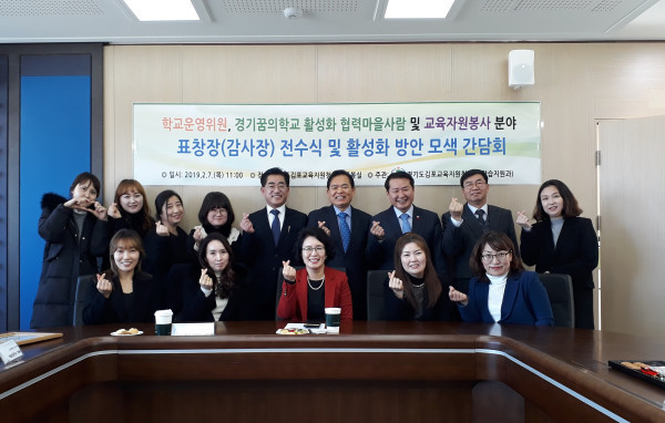경기도 김포교육지원청은 최근 김포교육지원청 중봉실에서 2018년 한 해 동안 김포 마을 교육 활성화를 위해 학교운영위원회, 경기꿈의학교, 교육자원봉사 분야에서 큰 공을 세운 11명의 수여자와 함께 전수식 및 간담회를 개최했다. 사진은 참여자들이 기념촬영을 하는 모습. (사진제공=김포교육지원청)