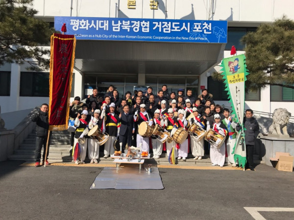 경기 포천시 포천동 주민자치위원회가 11일 ‘정월대보름 지신밟기 행사’를 개최했다. 이날 행사는 동 발전과 만복을 비는 기원제를 시작으로 진행됐다. 사진은 기원제를 지낸 후 풍물패 동아리 회원들이 동 관계자들과 기념촬영을 하는 모습. (사진제공=포천시청)
