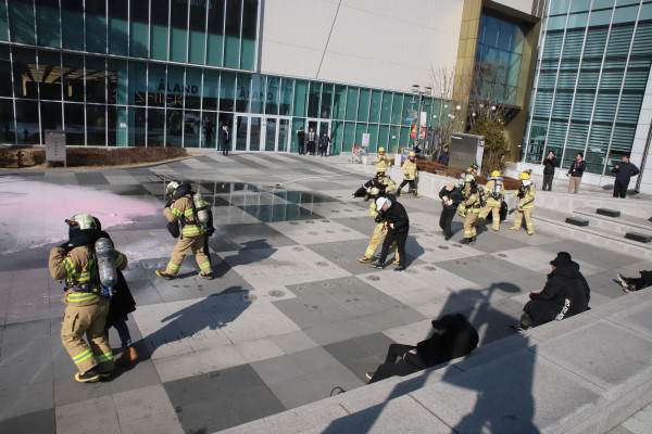 11일 서울 은평소방서가 진관동 롯데몰 은평점에서 은평경찰서, 은평보건소, 은평 롯데몰 등 11개 기관 200여명과 함께 다중이용시설 테러(폭발) 발생을 가정한 '유관기관 합동 대응훈련'을 실시했다. 이날 훈련은 은평 롯데몰 1층 출입구에서 미상 폭발로 인한 화재가 발생해 민간인 사상자가 다수 발생한 상황을 가정해 전개됐다. 사진은 훈련을 진행하는 모습.(사진제공=은평소방서)