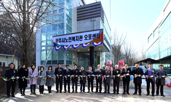 경기 광주시는 11일 '광주시노인복지관 오포센터 개관식'을 개최했다. 이날 개관식에는 신동헌 시장을 비롯해 박현철 시의회의장, 박용화 대한노인회 광주시지회장 등 주요 내빈과 노인 150여명이 참석했다. 사진은 관계자들이 테이프 커팅을 하고 있는 모습. (사진제공=광주시청)