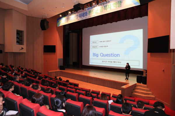 전남 완도군이 올해를 ‘해양치유산업 원년’으로 정하고 그에 따른 추진 역량을 강화하기 위해 최근 완도 문화예술의 전당에서 본청 및 읍·면 공직자 400여명이 참석한 가운데 ‘해양치유산업에 대한 이해와 공직자 역할’을 주제로 교육을 실시했다. 사진은 웰캄 I&D 기업 부설연구소 최미경 소장이 강의를 진행하는 모습. (사진제공=완도군청)