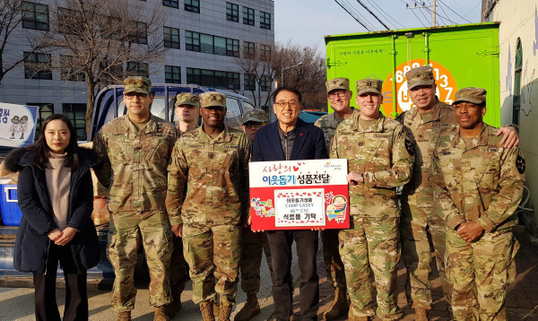 최근 미2사단 캠프 케이시 194지원대대 예하 46중대에서 350인 분량의 식료품(통조림 등)을 경기 동두천시에 기탁했다. 사진은 기탁식에 참여한 관계자들이 기념촬영을 하는 모습. (사진제공=동두천시청)