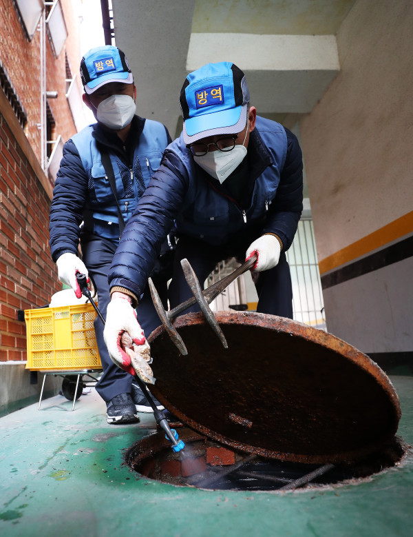 13일 오전 경기 수원시의 한 주택가에서 팔달구 보건소 관계자들이 모기 유충 구제 작업을 하고 있다.