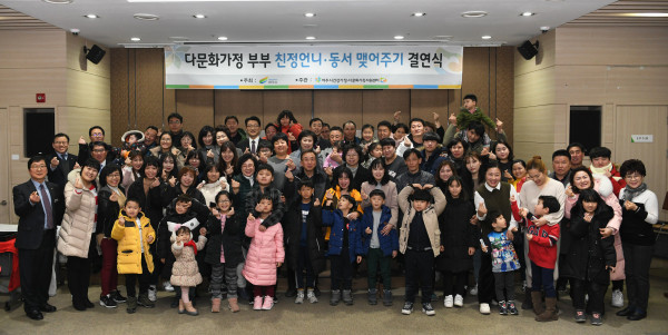 경기 여주시와 여주시건강가정·다문화가족지원센터가 12일 ‘다문화가정 부부 친정언니·동서 맺어주기’ 결연식을 맺었다. 사진은 이날 결연식에서 선정된 한국인가정 부부 14쌍과 다문화가정 부부 14쌍이 관계자들과 기념촬영을 하는 모습. (사진제공=여주시청)