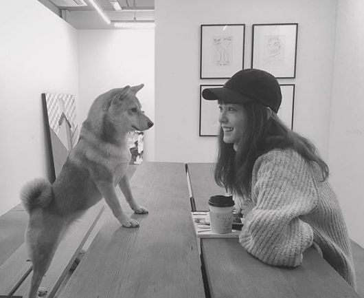공개된 사진 속에는 테이블에 마주 앉은 정유미와 강아지의 모습이 담겨있다.