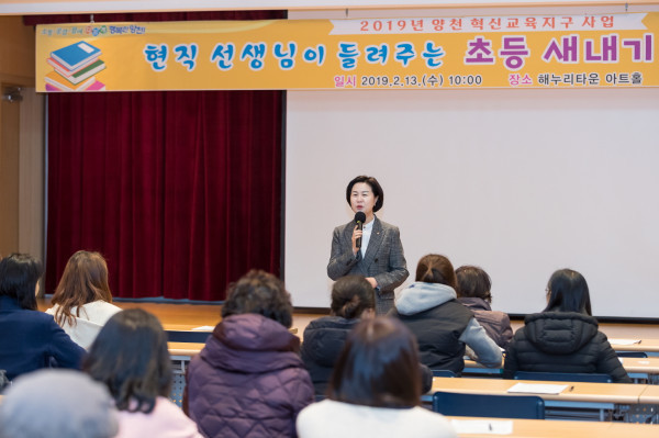 양천구가 13일 해누리타운 2층 아트홀에서 ‘초등 새내기 학부모 특강’을 개최했다. 이날 특강에서는 현직 교사를 초청해 교육과정 소개, 학교생활 적응 등의 강의를 했다. 사진은 김수영 구청장이 이날 특강에서 인사말을 하고 있는 모습. (사진제공=양천구청)