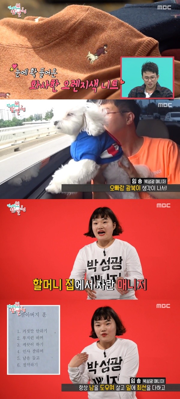 오렌지색 니트를 발견한 매니저는 “나 이거로 갈래”라며 옷을 결정했다. 그는 오렌지색 니트를 고른 이유로 “일단 색깔이 밝아서 좋았고요. 옷에 강아지랑 남자 그림이 그려져 있었는데 오빠랑 광복이가 떠올랐다”고 답했다.