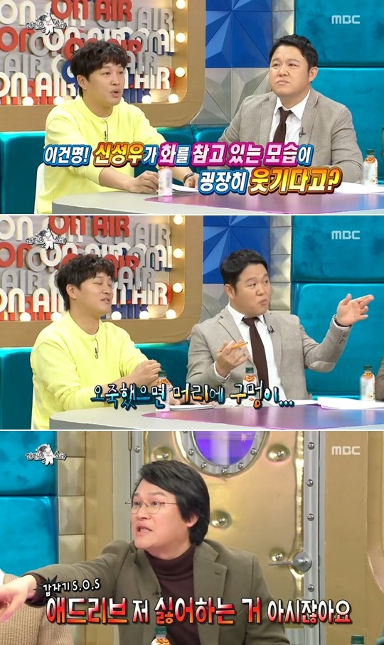 강성진은 "애드리브 때문이다. 애드리브를 정말 싫어한다. 그런데 저 애드리브 싫어하는거 아시지 않냐"며 '라스' 멤버들을 다급하게 불렀다. 그는 "제가 애드리브 하는 배우는 똥배우라고 저번에 '라스'에 나와서 말한적이 있다"고 설명했다.