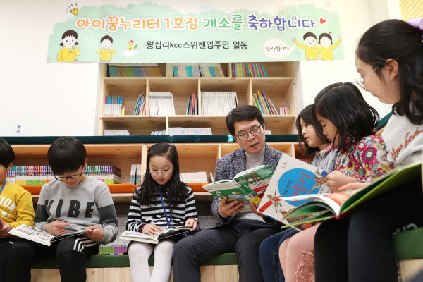 서울 성동구는 13일 초등돌봄센터 1호점인 ‘스위첸 아이꿈누리터’를 문열었다. 아이꿈누리터는 왕십리KCC스위첸 아파트내 유휴공간을 활용해 조성된 공간이다. 사진은 정원오 구청장이 아이꿈누리터에서 초등학생들과 함께 책을 읽는 모습. (사진제공=성동구청)