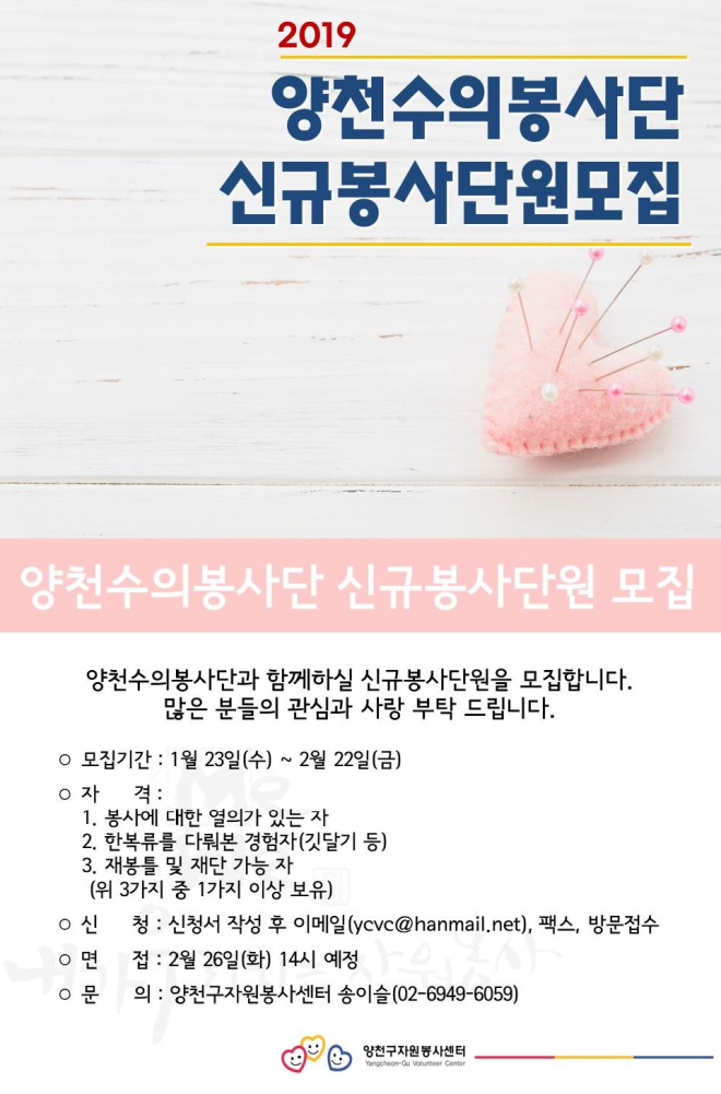 양천수의봉사단은 2001년 창단하여 매 해 손바느질 재능을 보유한 자원봉사자들이 모여 무병장수를 기원하는 장수옷을 만들고, 이를 양천구 관내 기초수급 및 복지사각지대에 위치한 저소득 독거어르신에게 전달하고 있다. 매주 금요일마다 4시간씩 센터에 마련된 공간에 모여, 한 땀 한 땀 손수 장수옷을 제작하고 있는 양천수의봉사단은 지난 2018년에도 장수옷 30세트(염포, 천금, 지요, 복보 외 13종)를 관내 독거 노인분들에게 전하는 전달식을 진행했다.