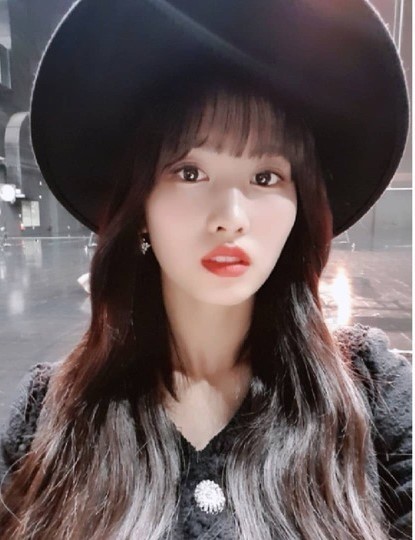 공개된 사진 속 모모는 챙이 커다란 검은색 모자를 쓰고 청초한 미모로 카메라를 응시하고 있다.