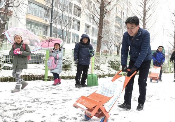 서울 노원구는 15일 오전 눈 피해 예방을 위해 제설작업에 총력을 기울였다. 이날 오승록 구청장과 동주민센터 공무원 등 400여명이 지역내 곳곳에서 제설작업을 했다. 사진은 오 구청장이 공무원들과 함께 제설작업을 하고 있는 모습. (사진제공=노원구청)
