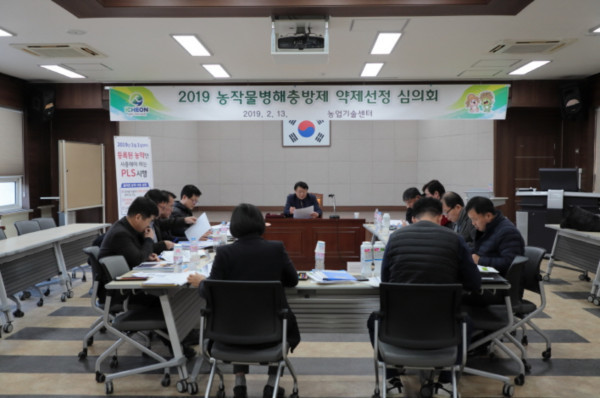 경기 이천시가 최근 농업기술센터 대회의실에서 2019년 농작물 병해충 방제를 위한 ‘약제선정 심의회’를 열었다. 사진은 벼 상습병해충, 친환경방제약제, 외래 돌발해충, 과수 돌발해충, 과수검역병 대한 약제선정 심의회를 진행하는 모습. (사진제공=이천시청)