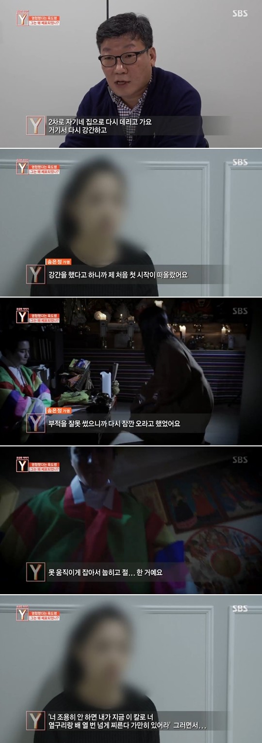 그녀는 "점 볼 때 집주소랑 핸드폰번호까지 다 알려준다. 이를 빌미로 가족들까지 언급하며 협박했다. 철사로 목을 굉장히 세게 졸랐다. 엉엉 우니까 칼로 허벅지를 찔렀다. 조용히 안하면 옆구리랑 배 열 번 넘게 찌른다고"라며 눈물을 흘렸다. 심지어 경찰 조사 결과 동영상까지 몰래 찍었던 사실까지 들어나면서 충격을 불러일으켰다.