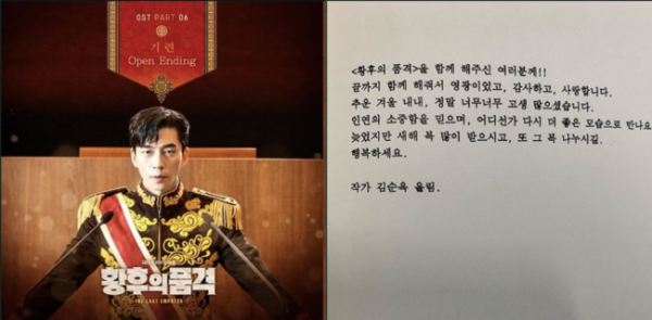 김순옥 작가는 "‘황후의 품격’을 함께 해주신 여러분께 끝까지 함께 해줘서 영광이었고, 감사하고, 사랑합니다. 추운 겨울 내내, 정말 너무너무 고생 많으셨습니다. 인연의 소중함을 믿으며 어디선가 다시 더 좋은 모습으로 만나요. 늦었지만 새해복 많이 받으시고 또 그복 나누시길 행복하세요"라며 여운을 남겼다.