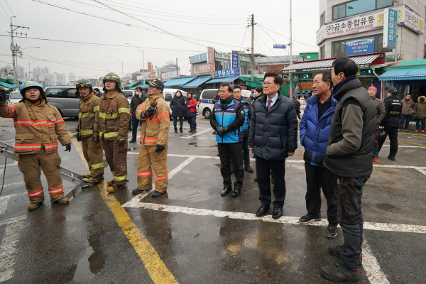 유덕열 서울 동대문구청장이 지난 15일 화재가 발생한 청량리농수산물시장을 찾았다. 이날 유 구청장은 동대문소방서로부터 화재 상황에 대한 설명을 듣고 피해 상인을 위로했다. 사진은 유 구청장 및 구청 관계자들이 소방관의 설명을 듣고 있는 모습. (사진제공=동대문구청)