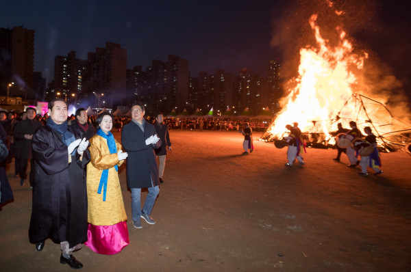 서울 양천구가 지난 16일 오후 안양천 둔치에서 ‘정월대보름 민속축제’를 개최했다. 이날 축제는 다양한 공연과 전통 놀이체험 마당, 달맞이 행사가 진행됐다. 사진은 김수영 구청장이 달집 태우기 행사 후 관계자들과 주위를 돌고 있는 모습. (사진제공=양천구청)