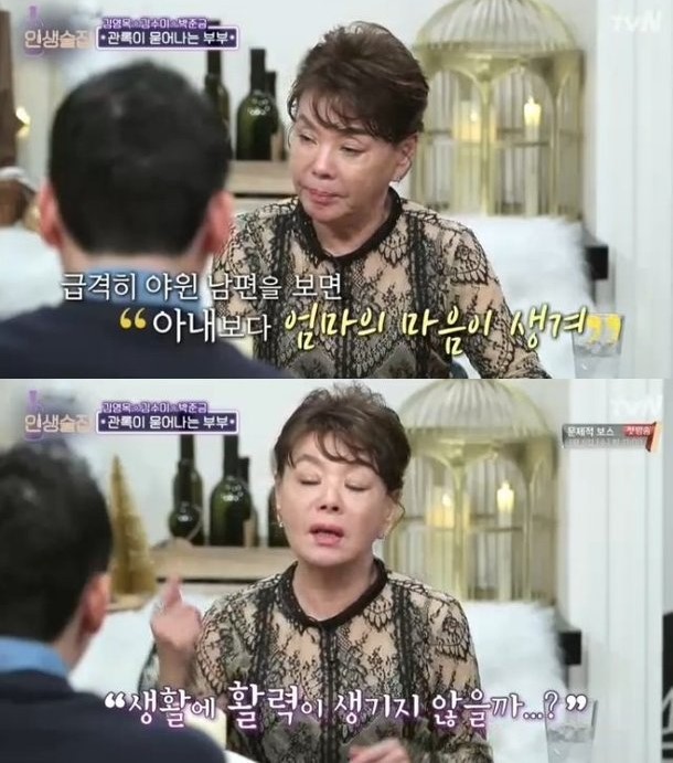 이어 김수미는 “솔직한 말로 데이트 했으면 좋겠다. 다른 여자라도 만나 말벗이라도 해서 활력을 찾았으면 좋겠다. 불과 몇 년 전만 해도 안 그랬는데 급격히 야윈 남편 모습을 보면 엄마 마음이 된다”고도 털어놨다.